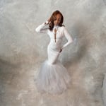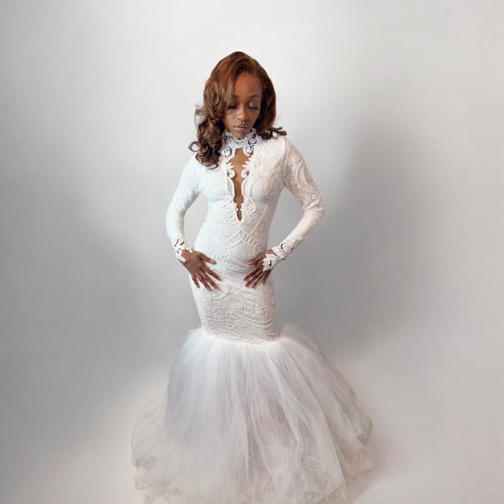 Make a statement on your special day in our breathtaking mermaid wedding gown, crafted with luxurious damask and soft bridal tulle. The intricate damask fabric hugs your curves, while the flowing tulle skirt adds a touch of ethereal elegance, creating a silhouette that's both unforgettable and flattering. Perfect for the bride who wants to feel both regal and romantic, this gown promises to be the highlight of your wedding day.