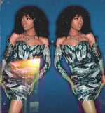 This pre-made gown is made out of a beautiful sequin lace material with a dark blue underlay, and a de-teachable train! It is in a size small, but it can be custom ordered or purchased as-is! Email us for more details before purchase!