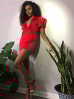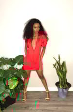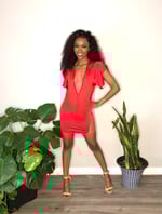 This dress is made of spandex fabric and illusion mesh along the leg slit and the v-cut. Dazzle everyone at your next event with this dress! This dress is 1of1 but it can also be custom ordered!